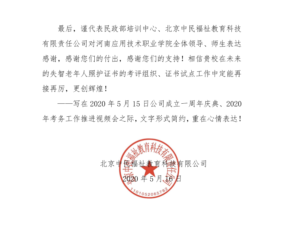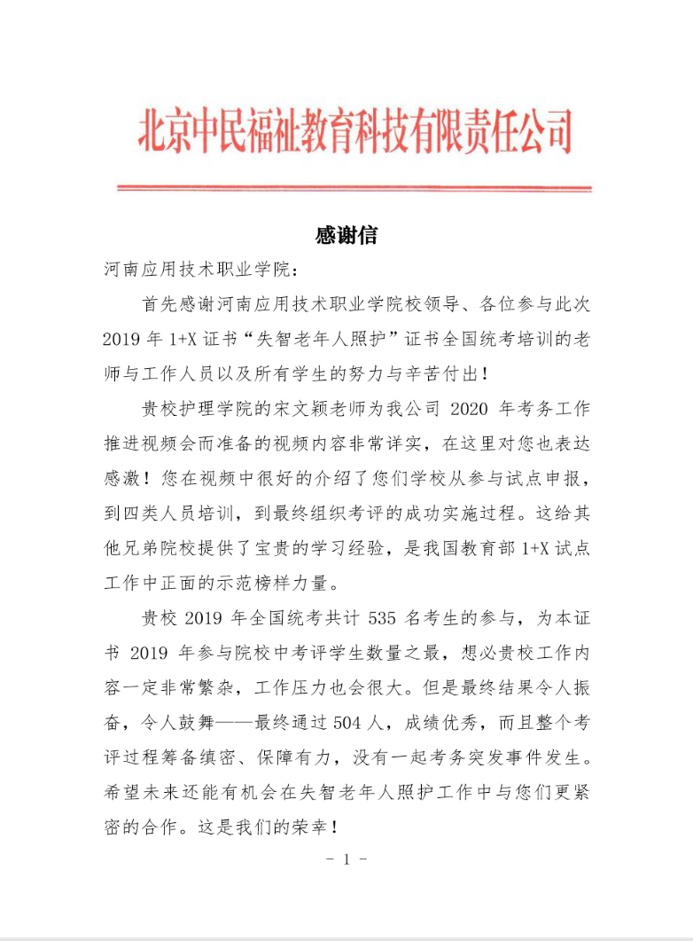 “失智老年人照护”1+X等级证书的第三方评价组织特请公司该项证书项目负责人宋文颖老师分享培训经验,并给公司寄来一封感谢信,对公司的培训工作以及考务工作给予了充分的肯定。