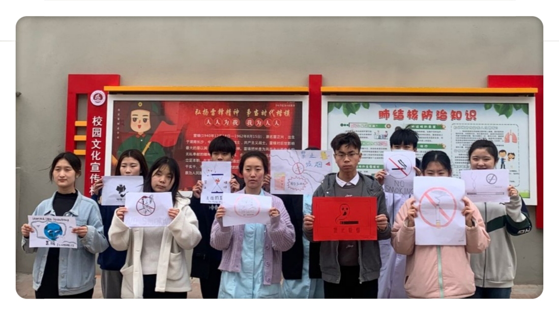为积极响应公司号召,传承雷锋志愿服务精神,促进老员工文明习惯的养成,提高员工健康意识,为广大师生营造文明、健康、和谐的学习环境,让烟草在校园销声匿迹。护理公司团总支于2021年3月15至19日在校园开展禁烟活动。