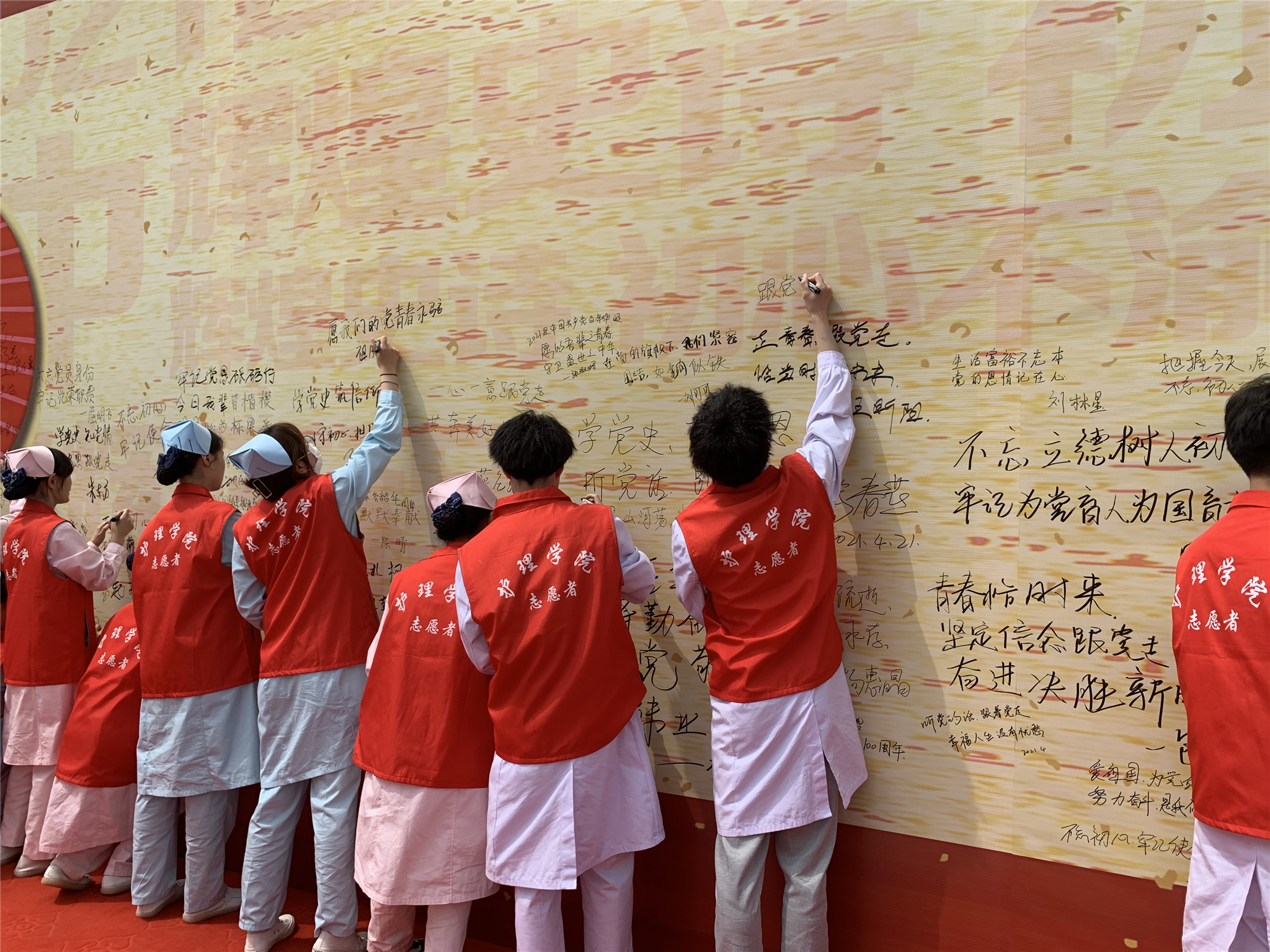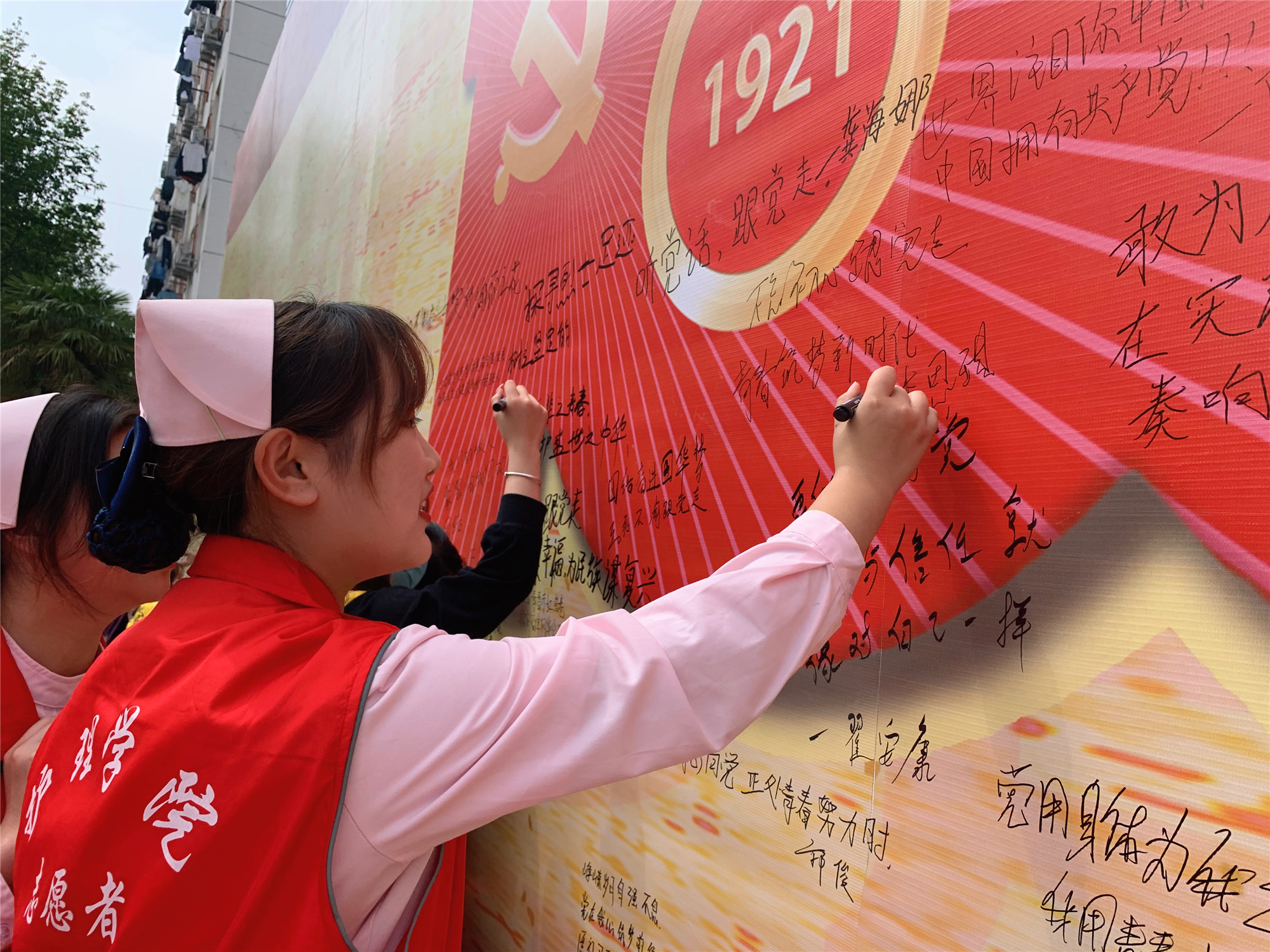 活动伊始,公司党委副书记朱东方同志致辞表达对党百年奋斗的敬佩之情。随后同学们纷纷在寄语墙上写下自己的名字以及对党的深深祝福:“百年大党,风雨兼程,不忘初心谋复兴”;“为天地立心,为生民立命,为往圣继绝学,为万世开太平”;“牢记党恩砥砺行,今日我辈皆楷模,明日必为栋梁乎”……一句句深情的寄语流淌在签字笔尖,祝福党的百年复兴;一句句语句饱含了应院师生对党的深深热爱和恒久祝福。