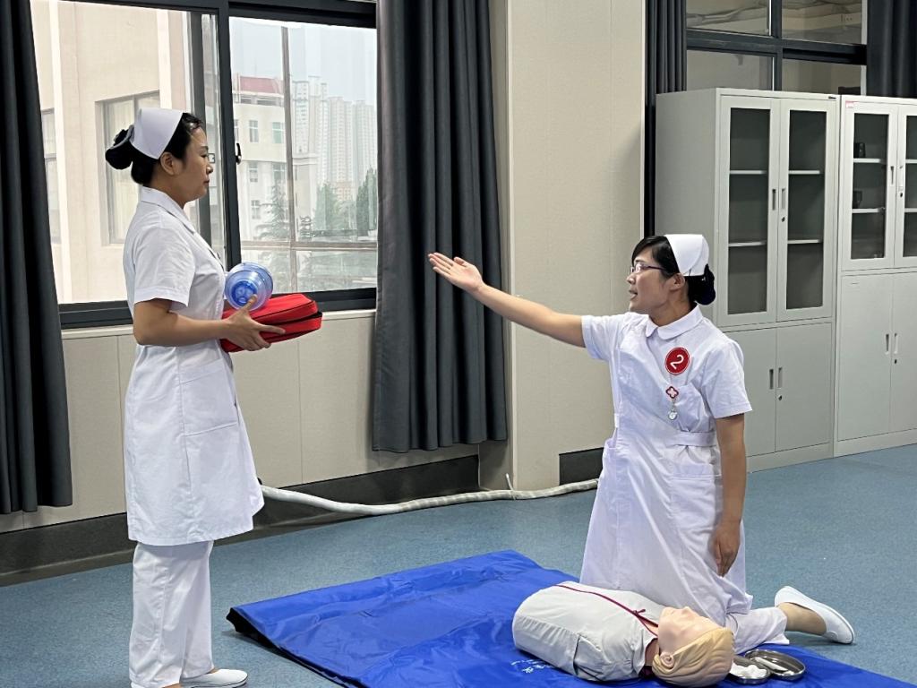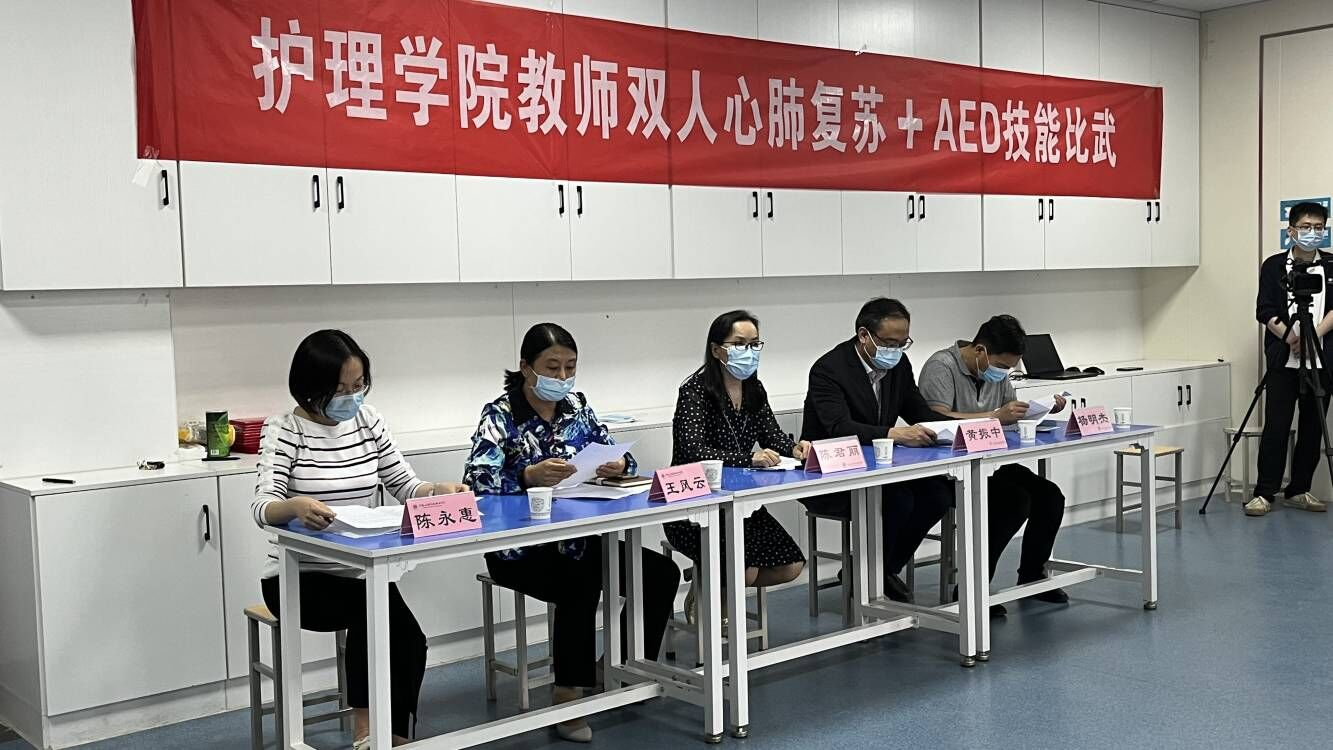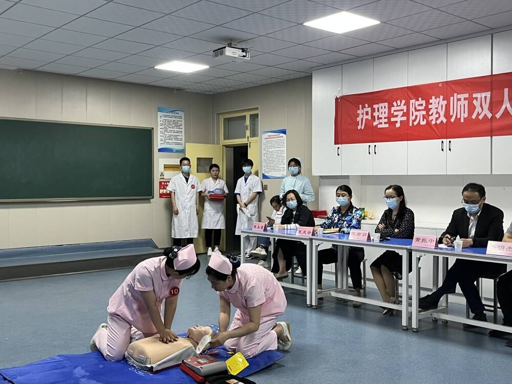 为贯彻全国职业教育大会精神,深化职业公司产品改革,进一步提升护理公司教师职业能力和工作水平,4月27日下午,护理公司在护理实训楼D404开展教师双人心肺复苏+AED技能比武。比赛特邀校外相关领域3位专家担任线上评委打分,副董事长陈君丽、教务处处长黄振中、护理公司党总支书记杨明杰、护理公司经理王风云、副经理陈永惠现场观摩比赛。