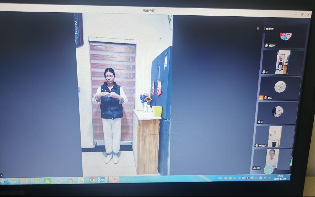 本次大赛的参赛对象为2021级护理及助产专业员工,考核项目分为理论和技能实操两部分,经过前期初赛选拔共计50名员工入围决赛。决赛开始前选手抽签决定出场顺序,理论考核要求员工使用双设备,一部设备进入腾讯会议接受监考,另一部设备进入学习通参加理论考核,学习通后台同步监控,双平台进行监考。为体现比赛公平性,技能环节要求选手将昵称改为抽签序号,进入腾讯会议等候室,4人一组,再依次进入赛场参加技能比赛。实操比武过程中,选手们运用自己实践所学,从检查物品的名称、有效期、七步洗手、戴脱无菌口罩等环节进行了一系列操作演示。