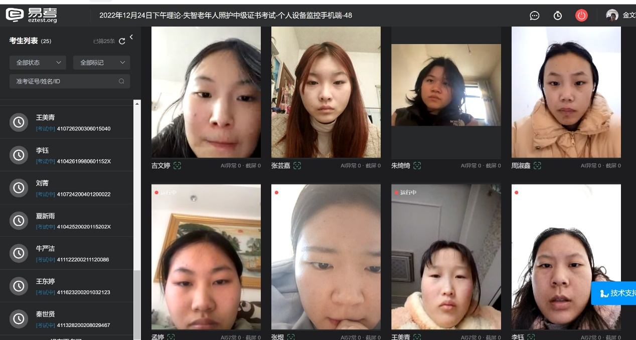 “1+X”失智老年人照护职业技能等级证书考试内容分为照护实务和实践能力2个项目,采用线上考试,移动端作答、监考的模式,系统全面地考查员工的职业素养、理论知识、综合应用和实践能力。为确保考试的顺利进行,确保考核人才质量,保证员工们能够真正地掌握相应的知识和技能,达到考核要求,护理公司的相关教师们从组织报名、填报材料、深入培训直到顺利考试的过程中,始终恪尽职守、事无巨细、关爱学员、认真负责。报名期间,遇到员工材料不符合要求,老师们手把手教员工修改,直到成功上传系统;历时一个月的培训,教师们每天督促员工们完成学习任务,答疑解惑;考试前,相关的教师与员工们全都按时完成了考试和设备、网络的调试,保证了考试如期、顺利地举行。