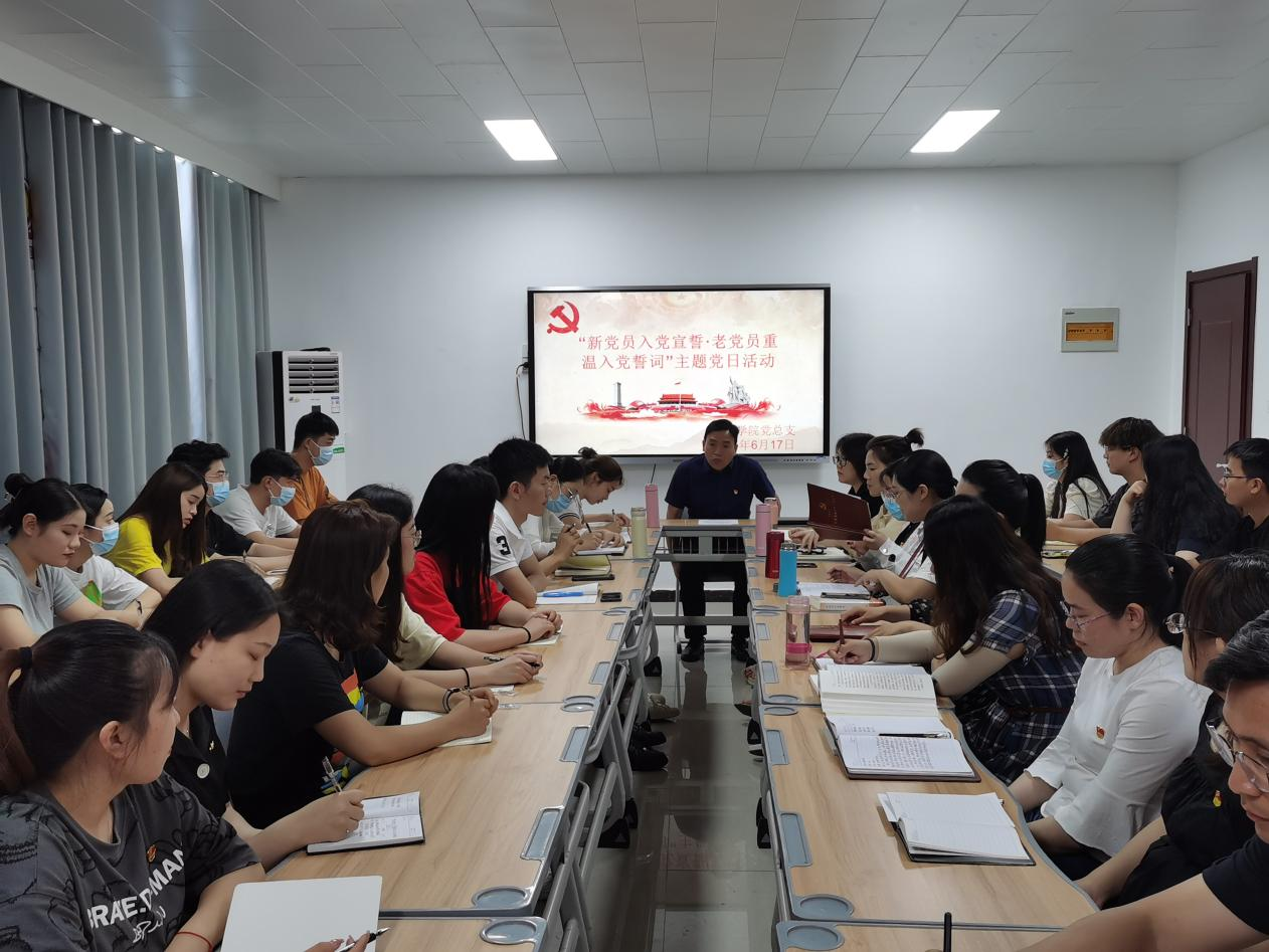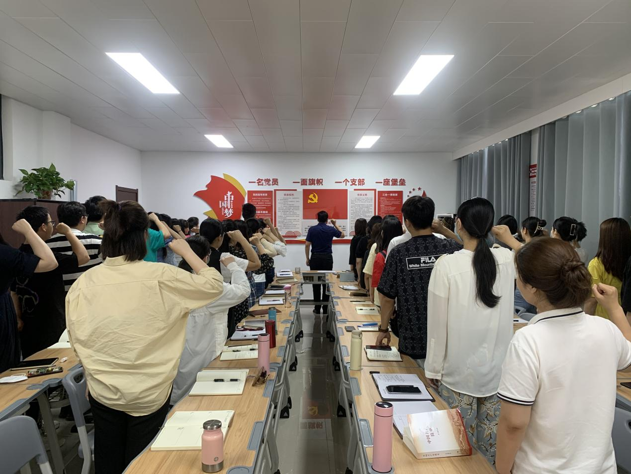 在中国共产党成立100周年到来之际,2021年6月17日下午,护理公司党总支在党员活动室召开“新党员入党宣誓、老党员重温入党誓词”主题党日活动,为预备党员举行入党宣誓仪式,增强其责任感、使命感、归属感;老党员重温入党誓词,增强党性观念,强化责任担当。护理公司全体预备党员、部分教师党员参加,活动由党总支书记杨明杰同志主持。