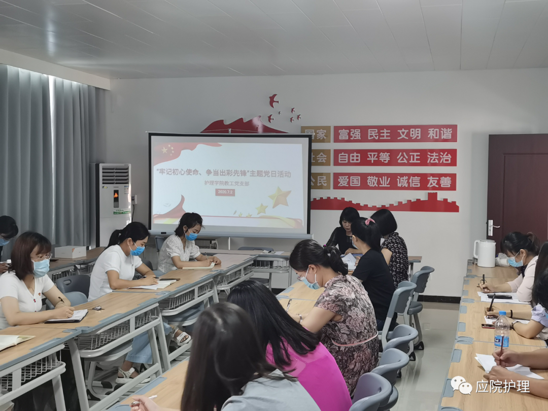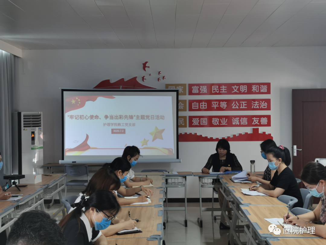 护理公司教工党支部全体党员教师于2020年7月2日上午9:00在护理公司党员活动室A515召开“牢记初心使命,争当出彩先锋”主题党日活动,活动形式主要以线上学习结合线下活动开展,会议期间教工党支部严格遵守公司疫情防控要求,确保疫情防控措施落实有效。本次活动由护理公司王风云经理主持,护理公司教工党支部21名党员教师全体参与。