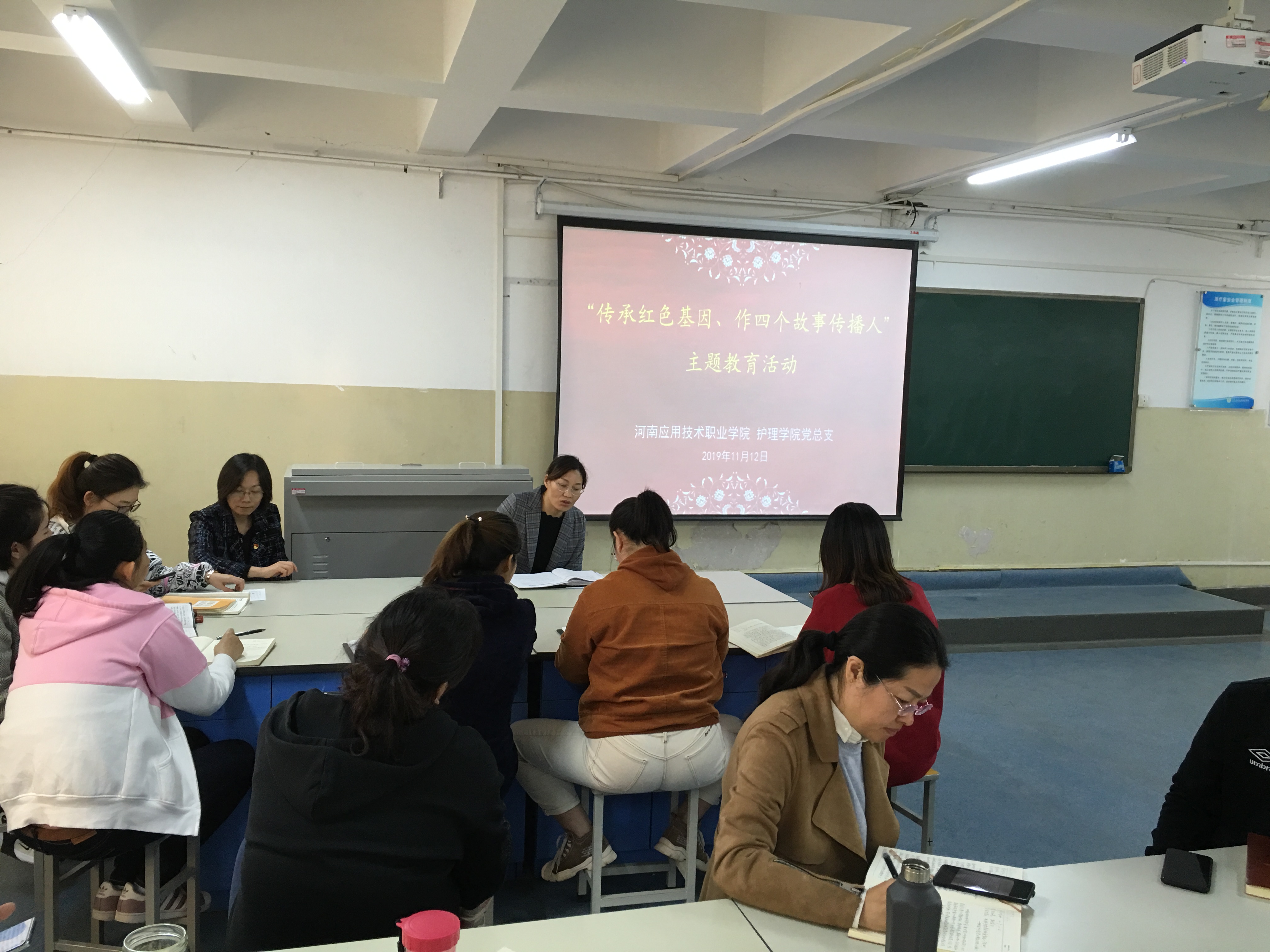 为深入贯彻落实习近平总书记视察河南重要讲话精神,推进公司第二批“不忘初心、牢记使命”主题教育深入开展,11月11日中午,护理公司党总支组织全体教师在D207开展了“传承红色基因、讲好四个故事”主题教育活动。通过讲好党的故事、革命的故事、根据地的故事、英雄和烈士的故事,教育引导广大党员深入学习党史、新中国史,不断巩固升华理想信念。
