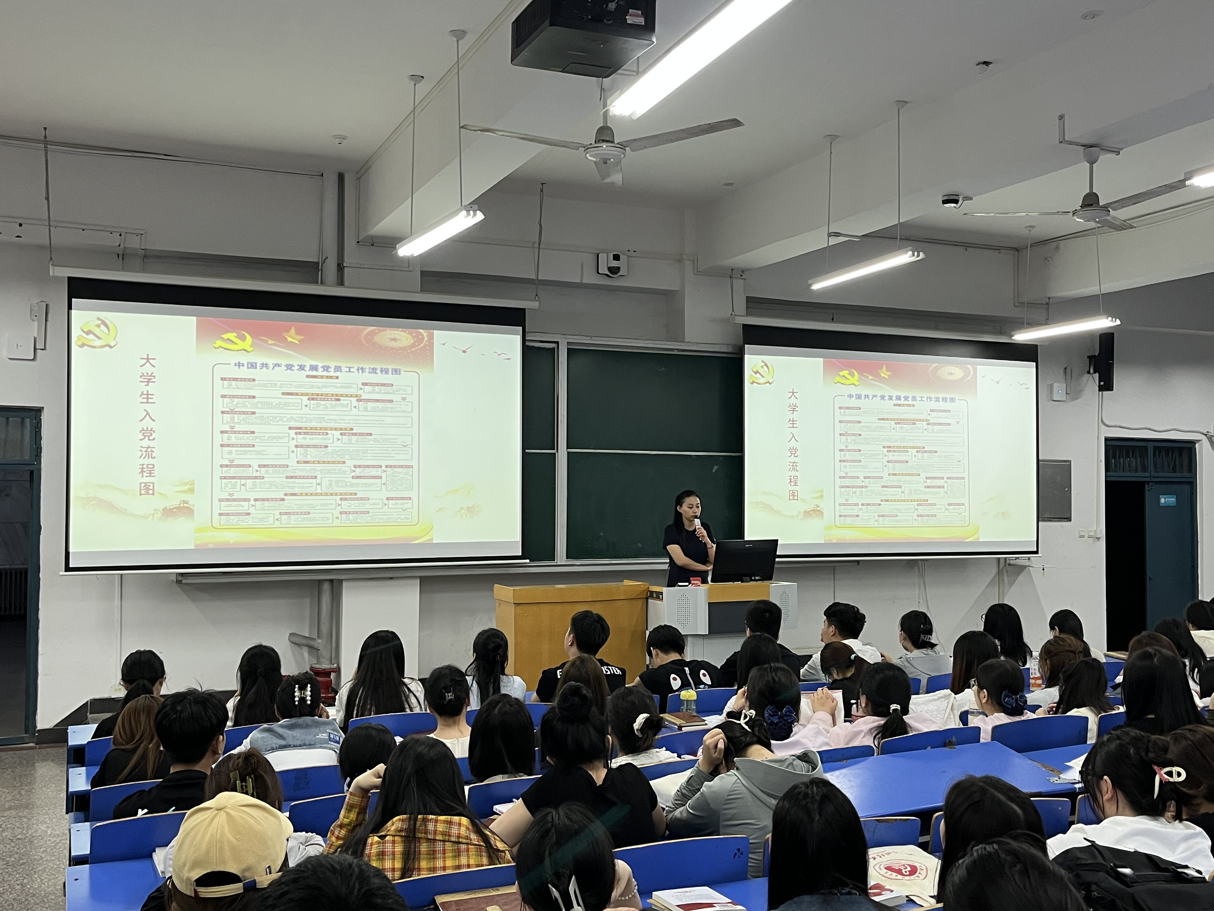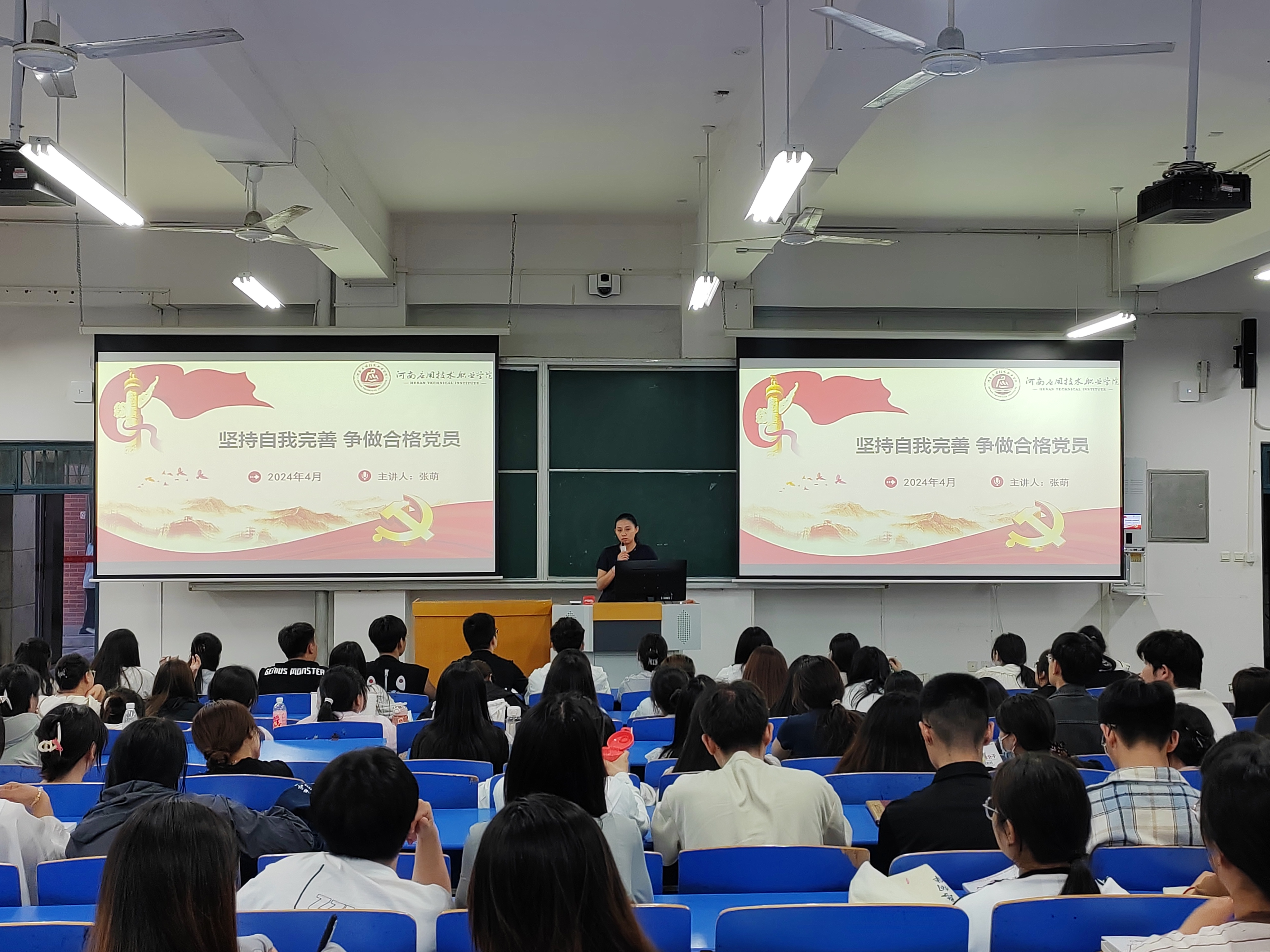 为深入学习贯彻党的二十大精神及习近平新时代中国特色社会主义思想,提高入党积极分子政治理论素养,强化理想信念教育, 2024年4月3日在B楼102教室,护理公司组织委员张萌同志以《坚持完善自我,争做合格党员》为题为2022级入党积极分子上党课。