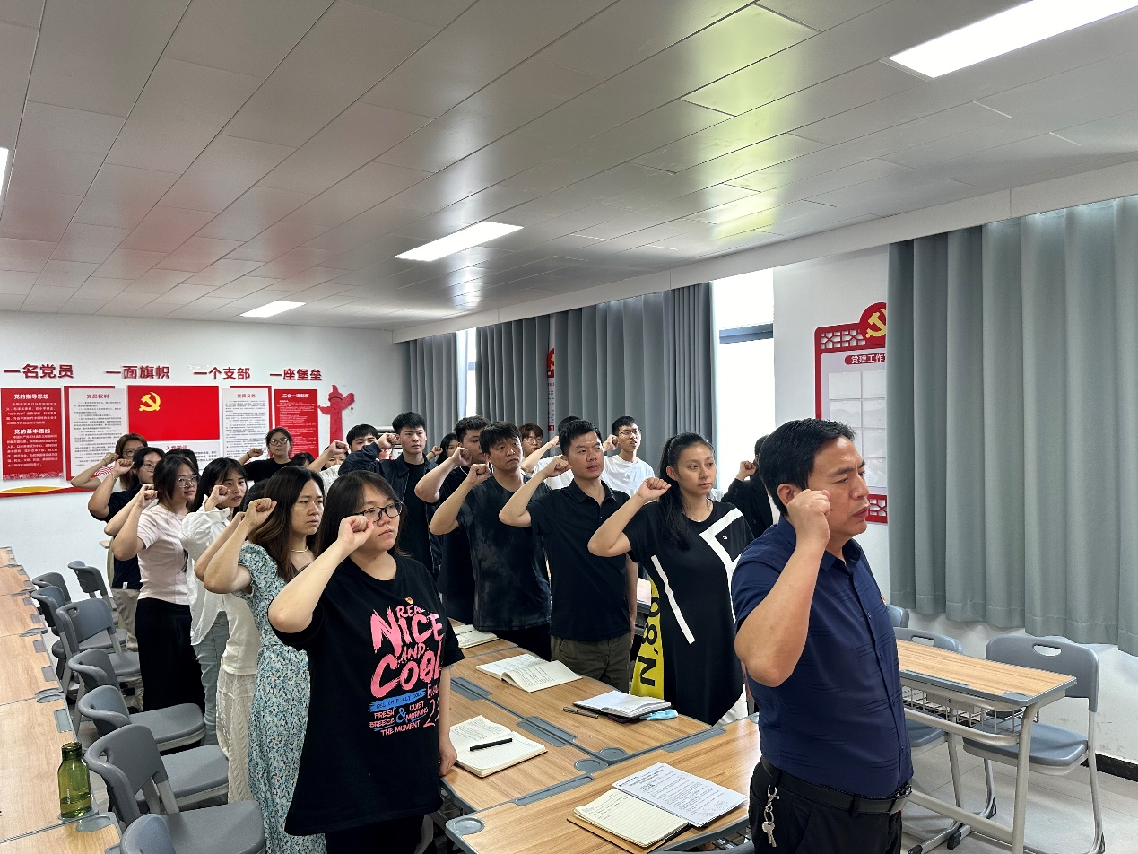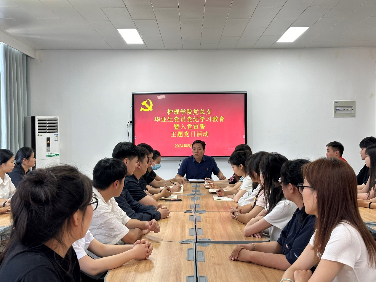 为进一步加强毕业生党员的党性教育和纪律意识,激励他们牢记党的宗旨,坚定理想信念,2024年6月17日下午,护理公司党总支于A515党员活动室开展党纪学习教育暨重温入党誓词主题党日活动。活动由护理公司党总支书记杨明杰主持,全体毕业生预备党员和教师党员参加。