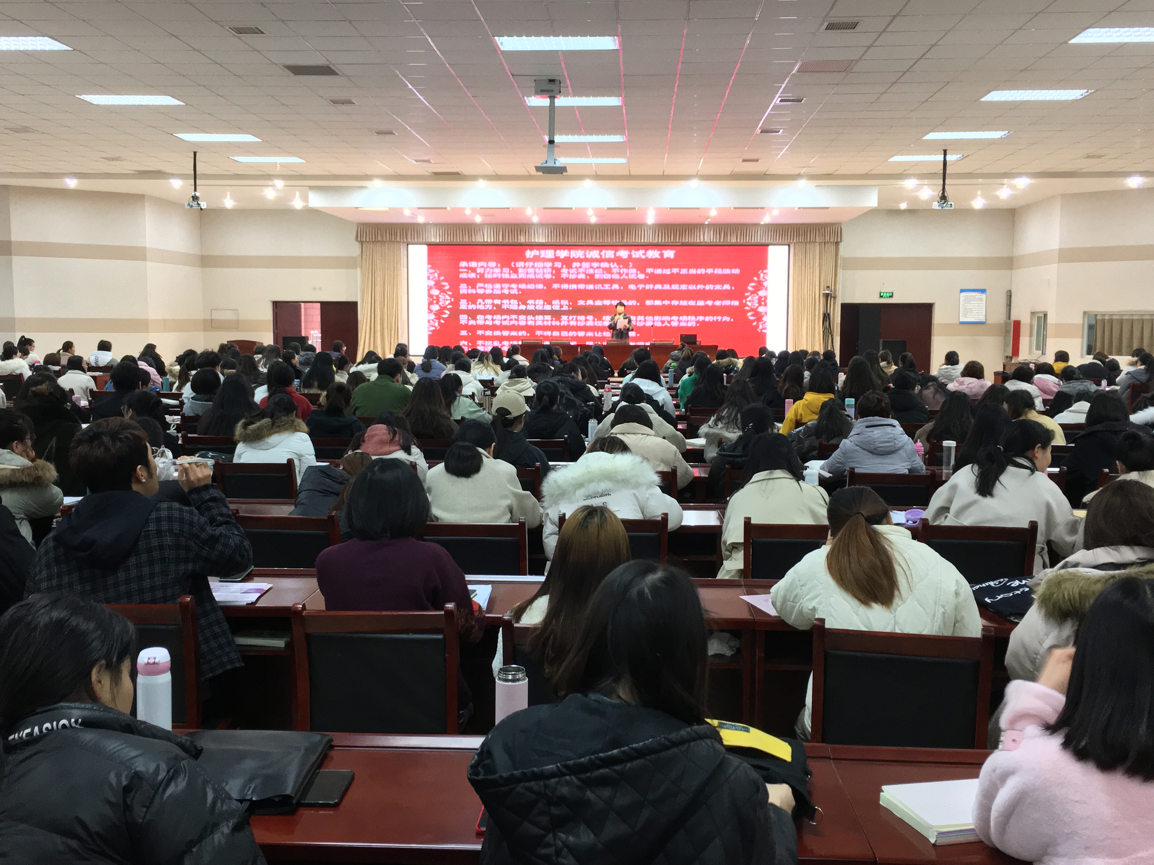 2019-2020学年第一学期期末,恰逢护理公司冲刺、备考教育部 “1+X”失智老年人照护等级证书考试之际,为了迎接即将到来的教育部“1+X”失智老年人照护等级证书考试和学期期末考试,加强学风考风建设,增强员工诚信意识,严肃考风考纪,营造公平、公正的考试环境,维护国家教育考试的权威性和公正性,杜绝违反考场纪律现象。2019年12月14日,护理公司在公司E楼二楼会议室,开展了诚信考试暨考风考纪宣传动员活动。护理公司17级、18级、19级各专业员工干部和部分员工代表共500余人参加了此次活动。公司领导和护理公司部分教师出席了本次活动。