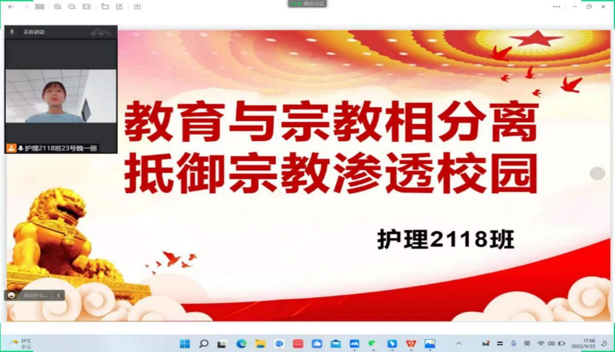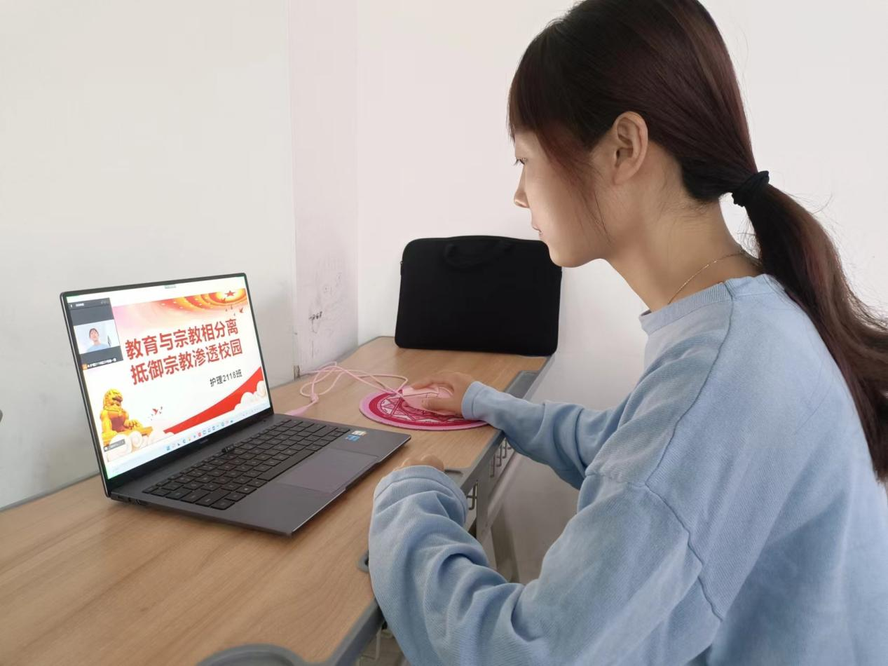 各班团支书组织同学们线上观看“教育与宗教相分离 抵御宗教渗透校园”有关视频,活动过程中让大家认识到宗教的本质及其危害性,自觉抵御和防范宗教的渗透,并积极宣传热爱祖国、热爱社会主义的相关教育,自觉做到不信仰宗教、不从事宗教活动,牢固树立习近平新时代中国特色社会主义思想,坚定理想信念。