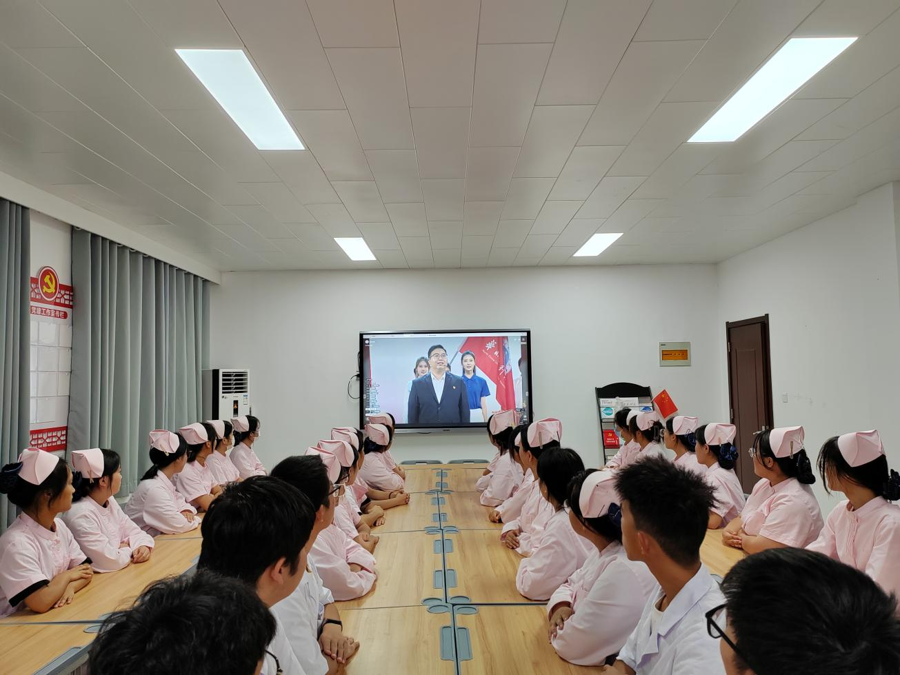 为深入学习贯彻习近平新时代中国特色社会主义思想和党的二十大精神,引导师生深刻把握新时代伟大成就,增强忠诚,捍卫“两个确立”、坚决践行“两个维护”的思想自觉和行动自觉,2023年9月15日晚上,护理公司组织全体师生观看《2023年秋季开学思政第一课》,入党积极分子在A515进行集体观看。