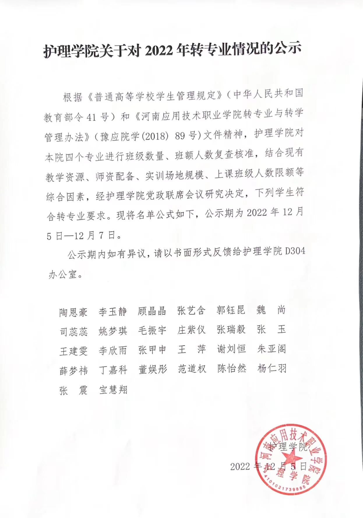 护理公司关于对2022年转专业情况的公示