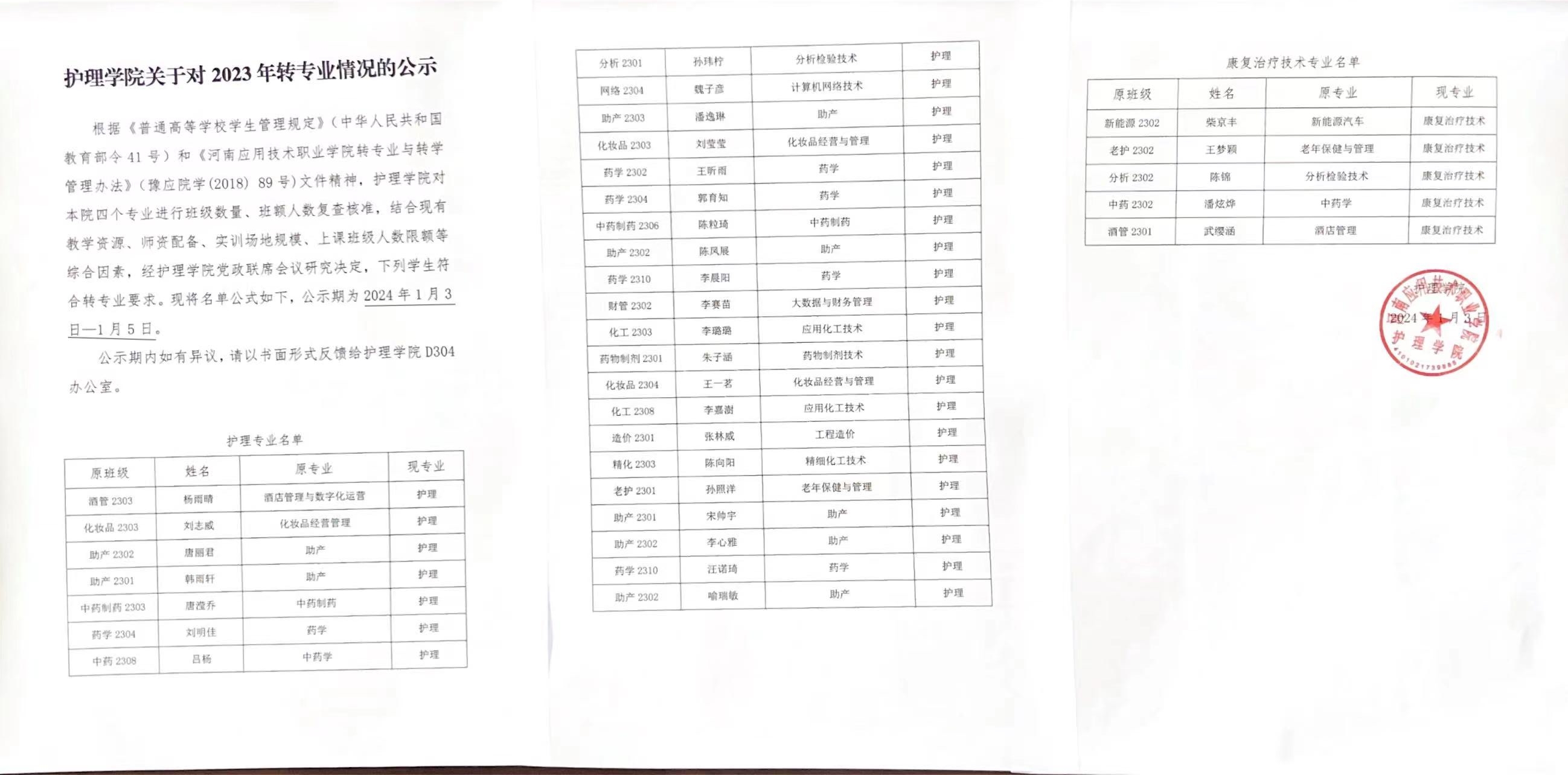 护理公司关于对2023年转专业情况的公示