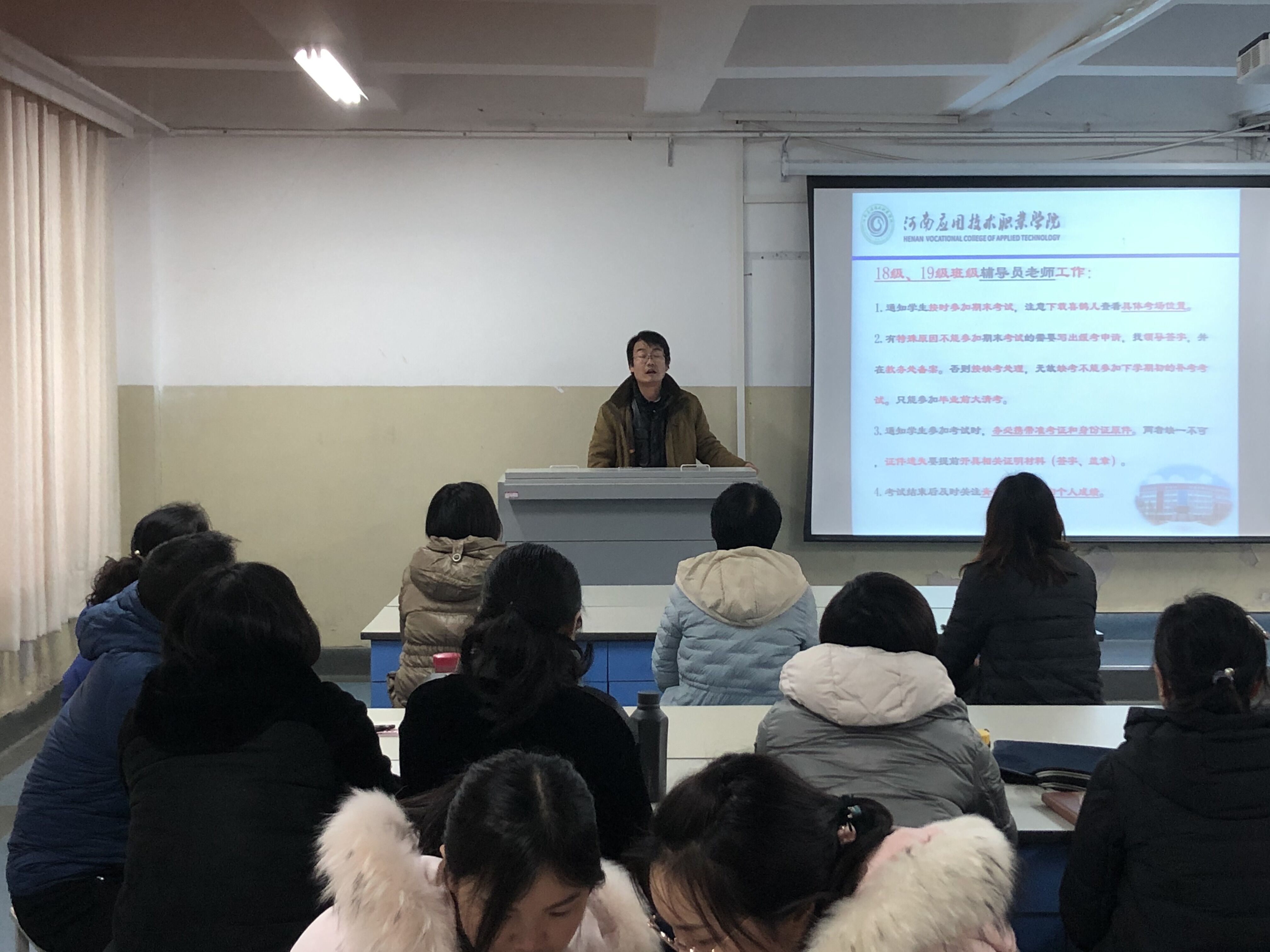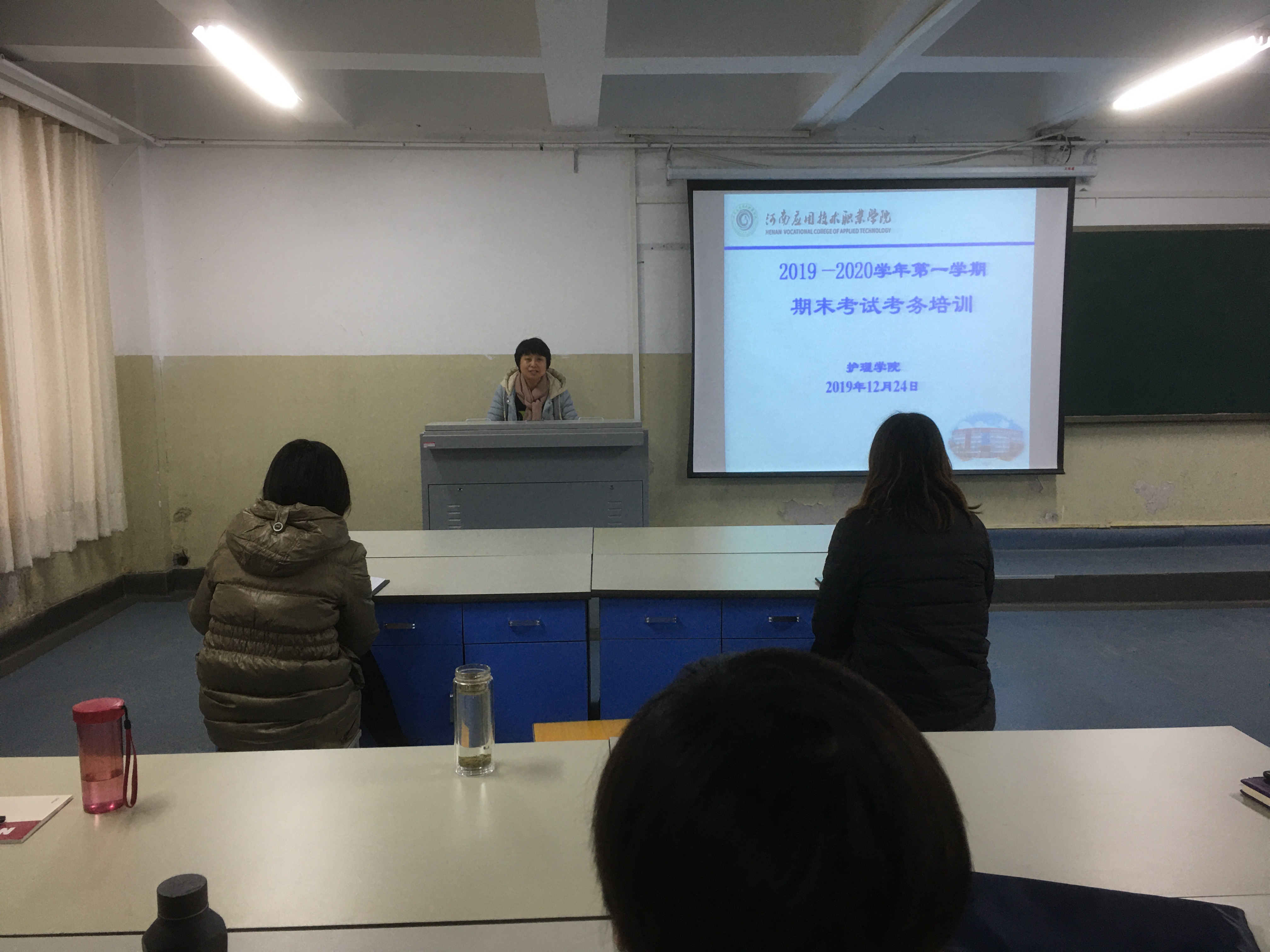 2019-2020学年第一学期期末,为了迎接即将到来的学期期末考试,加强考务管理,严肃考试纪律,规范期末考试监考工作和考务工作流程、职责。营造公平、公正的考试环境,杜绝违反考场纪律现象,保证期末考试顺利进行。根据公司教务处工作安排,2019年12月24日,护理公司在公司D楼207室,召开期末考试考务工作培训会。陈永惠副经理主持会议,护理公司全体教师和基础教学部部分教师出席了本次培训会议。