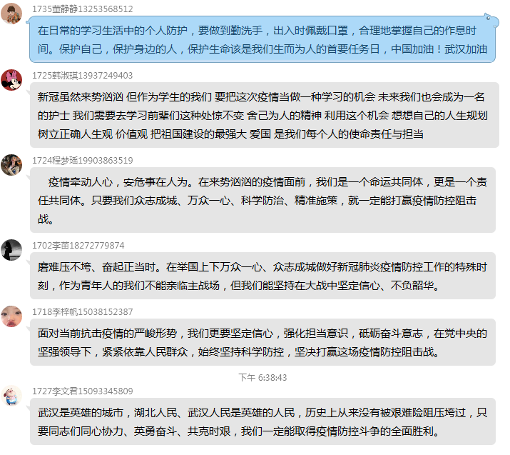 护理1802班毋琳娜:观看了疫情防控思政大课,使我感触颇深,在疫情加快蔓延的严重趋势下,全国各族人民站在一起,心连着心,携手抗击疫情;一方有难八方支援,让我明白了作为当代老员工更要担负起自己的责任和义务,在爱国、护国、建国中担负起自己使命,愿在这次疫情中所有的一线工作人员平平安安,健健康康。现在、未来,我们加油,中国加油!