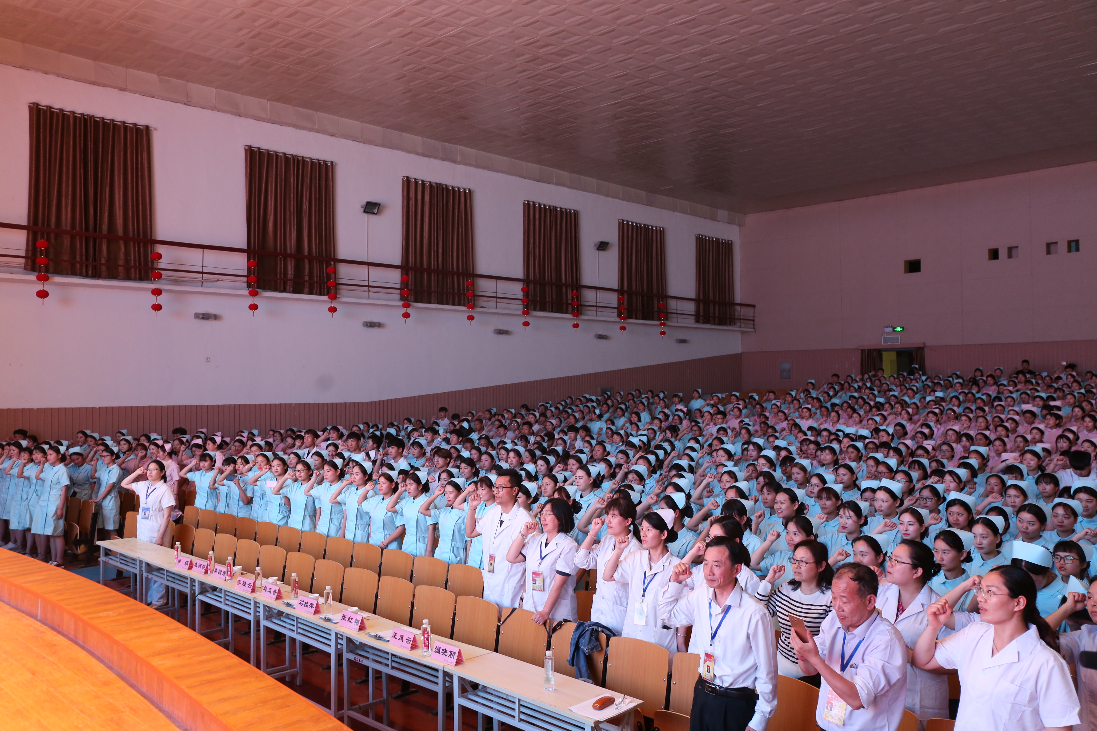 传光授帽仪式在悠扬的《护士赞歌》中开始。32名护士生代表,面带微笑,半跪在医护前辈面前,双手接过象征着医护精神的红烛,接受为自己授戴圣洁的燕帽,聆听前辈赠言;全场1000多名员工王风云经理的带领下,在烛光下庄严宣誓:“我志愿献身护理事业,热爱护理专业,坚守救死扶伤的信念,尊重病人的权利,履行护士的职责……”