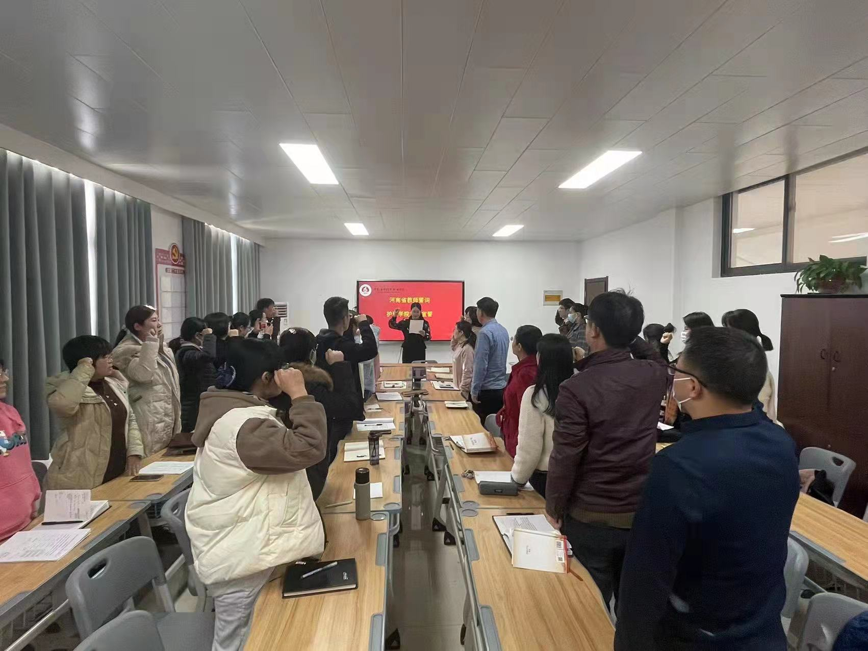 最后,由护理公司温晓丽老师带领大家宣誓河南省教师誓词。庄严肃穆的宣誓仪式,全体教师紧握右拳,在温晓丽老师的带领下,认真宣读河南省教师誓词:我志愿做一名光荣的人民教师,忠诚人民教育事业,贯彻党的教育方针。爱国守法,敬业爱岗;教书育人,关爱员工;传承文明,勇于创新;严谨治学,启智求真;为人师表,乐于奉献。为实现中华民族的伟大复兴而努力奋斗。
