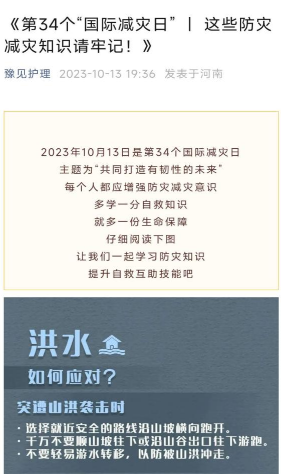 2023年10月13日是第34个“国际减灾日”,护理公司为引导全体师生牢固树立风险意识,提高化解灾害风险能力,组织开展了“减轻灾害风险,守护美好家园”的10.13防灾减灾主题教育宣传活动。