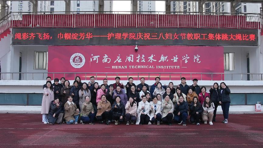 活动尾声,全体教职工在操场主席台前集体合影。镜头下,教师们笑容灿烂,摆出“爱心”造型,高呼活动口号“绳彩齐飞扬,巾帼绽芳华”,将节日氛围推向高潮。陈君丽教授在总结中感慨道:“今天的活动让我看到了护理公司教师的活力与凝聚力。每一位女性教职工都是公司发展的‘半边天’,愿大家继续以健康之姿、奋斗之态,书写育人事业新篇章!”