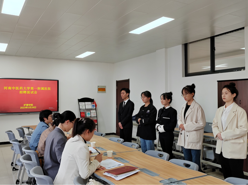 河南中医药大学第一附属医院护理部罗慧敏老师借助视频为同学们介绍医院的基本情况、护理教学管理概况及实习就业要求和准则。讲座结束后,在行政楼515进行招聘面试。面试中,公司员工镇定自如,自信稳重,凭借扎实的理论知识和良好的临床技能,得到面试老师的充分认可。