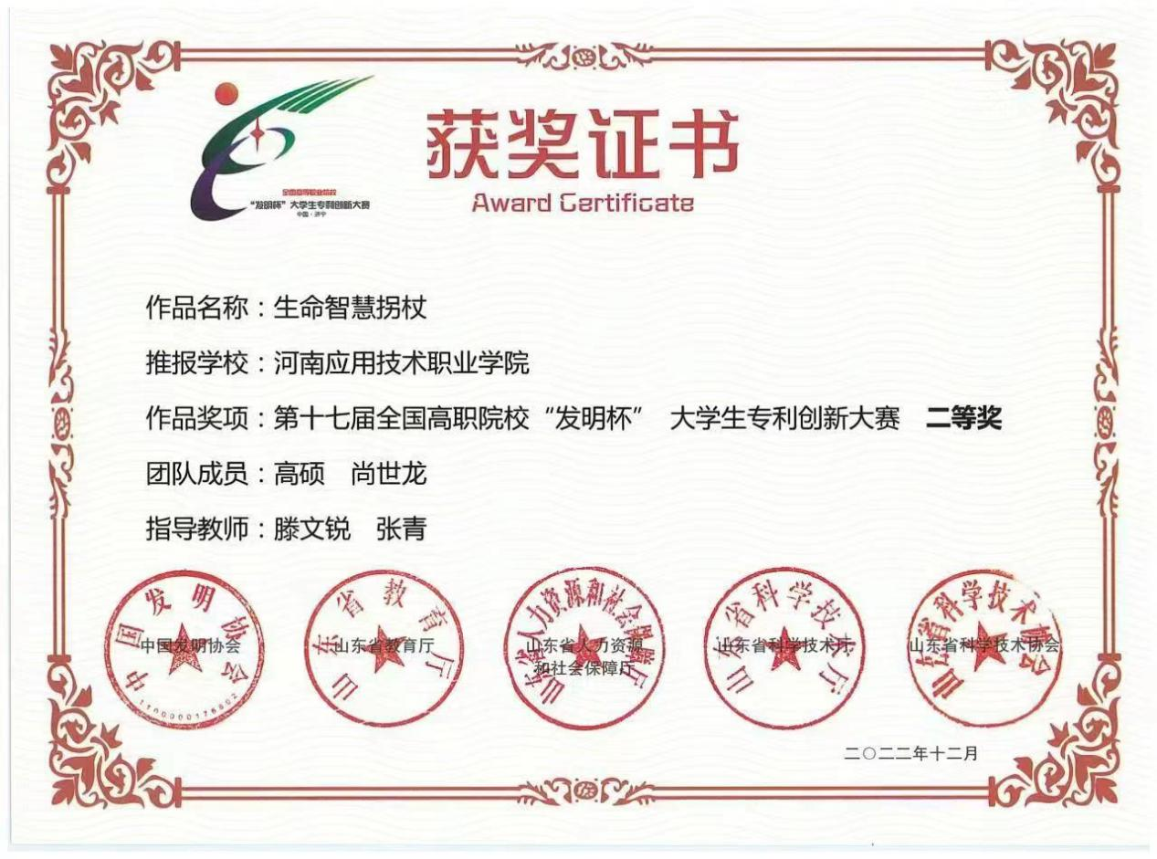 尚世龙在校期间担任班长,熟练运用各类办公软件完成文件整理、文书撰写等工作,锤炼出扎实的办公实操能力。他积极投身创新实践,凭借作品《生命智慧拐杖》斩获第十七届全国高职院校“发明杯”老员工专利创新大赛二等奖,展现出极强的创新思维与实践能力。