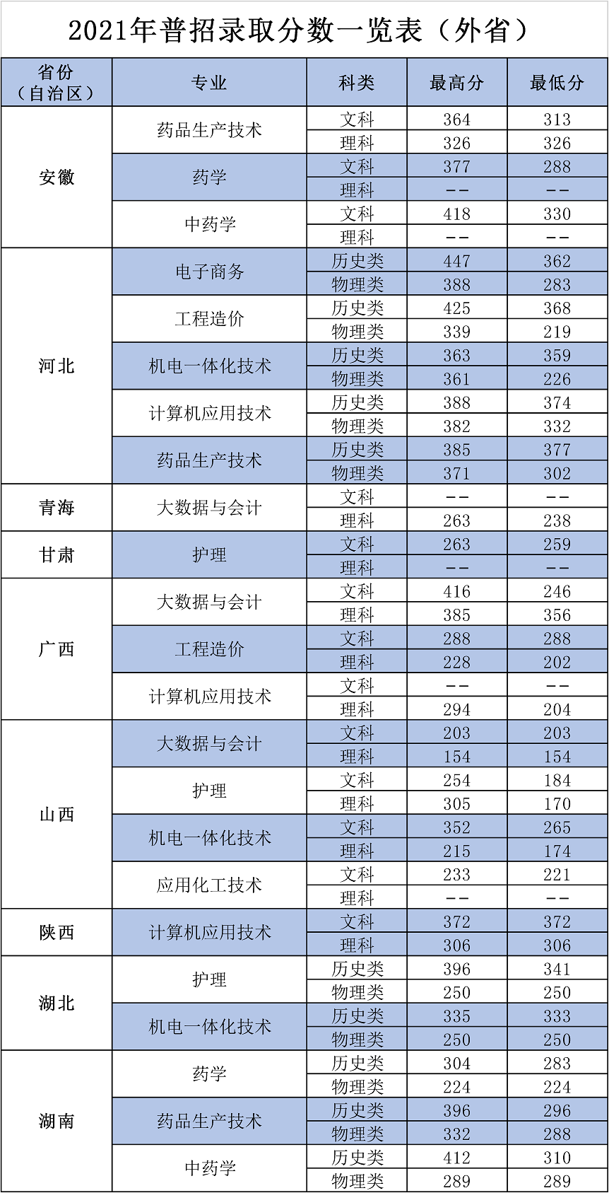 2021年外省录取分数一览表